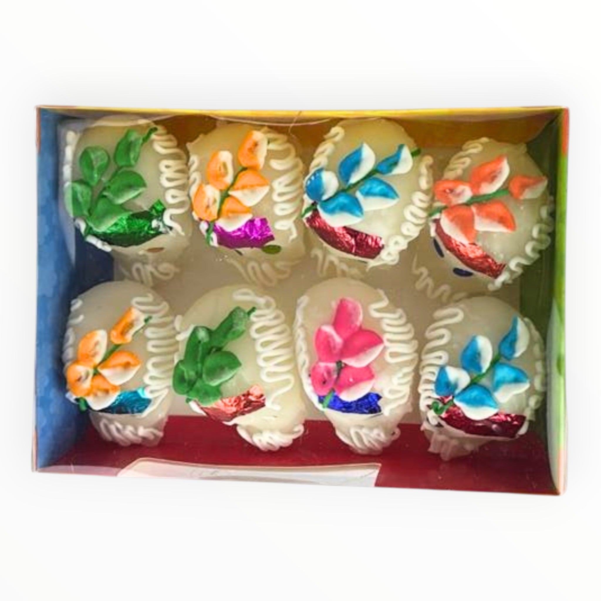 Calaveritas de azúcar tamaño #4, elaboradas de forma tradicional y listas para decorar altares u ofrecer como detalle típico de Día de Muertos. El paquete incluye 8 piezas, cada una con medidas aproximadas de 5 cm de alto, 4.5 cm de ancho y 7 cm de largo.