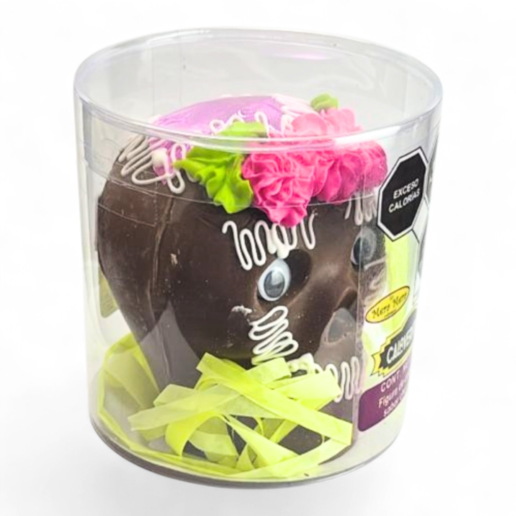 Calaveras de chocolate tamaño #7i, elaborada con chocolate de excelente calidad y decoradas con detalles tradicionales. Cada paquete incluye 1 pieza con las siguientes medidas aproximadas: 12cm de alto, 11cm de ancho y 10.5 cm de largo.